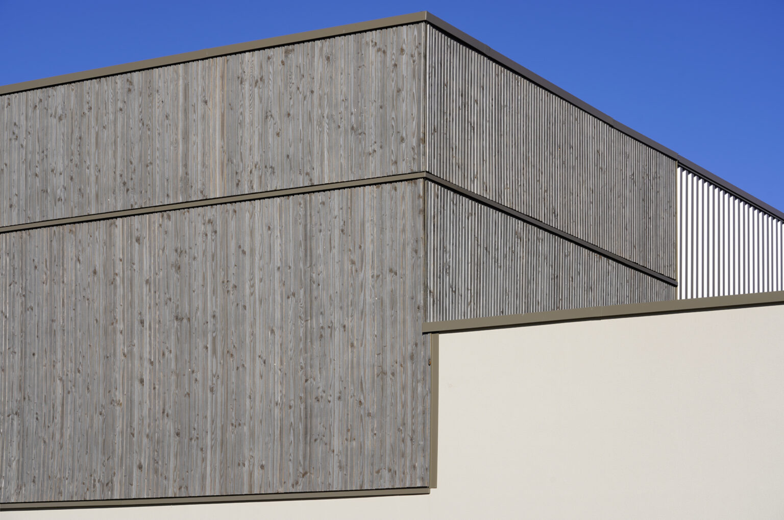 Bâtiment performant, socle minéral en maçonnerie + ITE fibre de bois enduite, charpente bois ou métal, isolation fibre de bois + bardage bois lames verticales. PAC réversible et ventilation double flux.